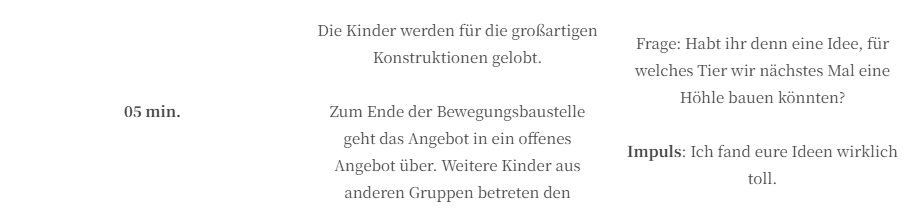 During the targeted programme, almost all educational and developmental areas are covered, including ‘body’, ‘thinking’, senses, ‘feelings and empathy’, ‘language’ and areas of the educational and developmental field ‘meaning, values and religion’. However, due to the planned type of programme (movement construction site), mainly and increasingly the areas of ‘thinking’, “senses” and ‘body’ are addressed.
