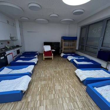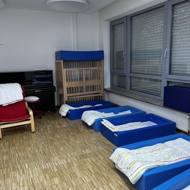 Hierzu lässt sich sagen, dass der Schlafraum im Raumkonzept nicht ursächlich als dieser geplant und eingerichtet wurde. Dieser war zuvor als Gruppenraum für eine Kitagruppe geplant und dementsprechend ausgestattet. Nachdem diese Kita-Gruppe aus Platzgründen die Räume wechselte, erhielt dieser Raum eine neue Funktion als Schlafraum, mit all seinen Vor- und Nachteilen.