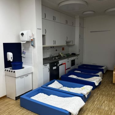 Für die Kinder selbst spielt die Transition vom Mittagessen zum Schlafen gehen eine große Rolle. Auch hier möchte ich nochmals auf die besonderen Herausforderungen aufgrund der Inklusion von körperlich wie geistig eingeschränkten Kindern hinweisen. Diese Umstände führen aus meiner Sicht dazu, dass an den Schlafraum in meiner Praxiseinrichtung große Anforderungen gestellt werden müssen und diese derzeit nicht erfüllt werden.